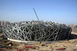 11月30日,2008年奧運會主會場——國家體育場最關鍵的項目——鋼結構吊裝施工全部完成,這標志著國家體育場主體結構工程施工全部結束,施工重點將轉向膜結構、裝飾裝修、機電設備安裝和室外工程施工。圖為國家體育場(鳥巢)施工現場。