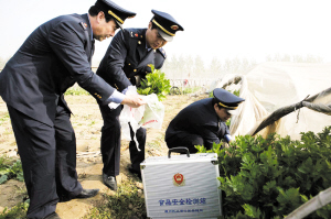 近日,來(lái)自北京市工商局通州分局的食品檢測(cè)員與河北省香河縣工商局執(zhí)法人員聯(lián)手對(duì)蔬菜種植基地、批發(fā)市場(chǎng)上銷售的蔬菜進(jìn)行了抽檢,將監(jiān)管關(guān)口前移到田間地頭,以確保進(jìn)京食品源頭的安全。焦艷玲 攝