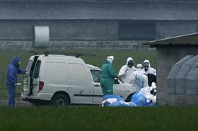 2月5日,在英國(guó)東部地區(qū)霍爾頓出現(xiàn)禽流感疫情的一農(nóng)場(chǎng),工作人員身著防護(hù)服裝從一輛小貨車上卸下裝火雞的袋子。英國(guó)環(huán)境、食品和鄉(xiāng)村事務(wù)部當(dāng)日晚宣布,英國(guó)出現(xiàn)禽流感疫情農(nóng)場(chǎng)的15.9萬只火雞已被全部撲殺。新華社/路透