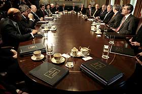 2月5日,在美國首都華盛頓白宮舉行的內(nèi)閣會議上,幾本美國2008財政年度預(yù)算報告被擺在桌子上。當(dāng)日,美國總統(tǒng)布什向國會提交2008財政年度預(yù)算報告時提出總額為7165億美元的軍費申請。新華社/路透