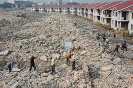 工人們正在一片廢墟回收廢棄的鋼筋。這片位于國(guó)家旅游度假區(qū)北海銀灘入口處的爛尾別墅群建于上個(gè)世紀(jì)九十年代初,成為那一輪“房地產(chǎn)熱”的遺留泡沫。由于開(kāi)發(fā)商違規(guī)抵押,造成產(chǎn)權(quán)不清、債務(wù)錯(cuò)綜復(fù)雜,北海市最近將這最難啃的“爛尾樓”骨頭成功拍賣(mài),全部87幢別墅正在進(jìn)行拆除,原址將按功能區(qū)規(guī)劃建設(shè)旅游項(xiàng)目。 |
