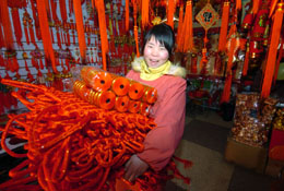 2006年,臨沂市各大專業(yè)批發(fā)市場實(shí)現(xiàn)交易總額450億元,帶動了老區(qū)近百萬農(nóng)村勞動力進(jìn)城就業(yè)。圖為2月12日,來自蒙陰縣的打工妹劉溶在臨沂西郊年貨商品批發(fā)城搬運(yùn)春節(jié)飾品。