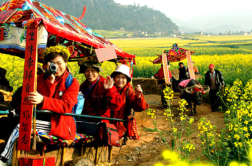 2月24日,游客乘農(nóng)家旅游牛車在羅平縣金雞村的油菜地里游覽。 云南省羅平縣素有“油菜之鄉(xiāng)”的美稱,目前,全縣種植的36.6萬多畝生態(tài)油菜正值盛花期,每天吸引萬名游客來此觀光。羅平縣實施“花開時分搞旅游,收獲時節(jié)賣菜籽”的發(fā)展方針,既拉動了菜花觀賞旅游業(yè)的發(fā)展,又促進了科學(xué)種田和農(nóng)村生態(tài)環(huán)境保護,農(nóng)民從中得到雙重收益。