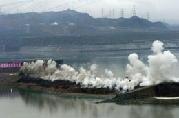 28日,三峽工程右岸下游圍堰成功爆破拆除。三峽下游圍堰爆破拆除后,三峽大壩將實(shí)現(xiàn)上下游面全線擋水,為三峽右岸電站首批機(jī)組投產(chǎn)發(fā)電創(chuàng)造條件。圖為三峽工程右岸下游圍堰爆破的瞬間。