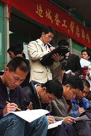 2月28日,幾位青年在廣州市勞動(dòng)力市場(chǎng)服務(wù)中心前填寫(xiě)應(yīng)聘表格。 廣東省勞動(dòng)部門(mén)近期對(duì)全省303家企業(yè)用工定點(diǎn)抽樣調(diào)查顯示,2006年廣東省六成企業(yè)嚴(yán)重缺工,勞動(dòng)力市場(chǎng)需求為729.92萬(wàn)人次,而求職者只有482.24萬(wàn)人次。