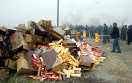 當(dāng)日,安徽省巢湖市無為縣工商、質(zhì)檢、藥監(jiān)等部門聯(lián)手在該縣蜀山鎮(zhèn)舉辦假冒偽劣商品集中銷毀行動(dòng)。執(zhí)法人員還向現(xiàn)場(chǎng)群眾介紹識(shí)別假冒偽劣商品的方法。