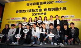 第二屆香港音樂匯展將于3月21日至23日在香港會(huì)展中心舉行,屆時(shí)將有70多家來自中國(guó)內(nèi)地、香港以及韓國(guó)、新加坡的唱片公司、新媒體及音樂硬件商參展。圖為香港各大唱片公司主要合約歌星出席第二屆香港音樂匯展記者會(huì)。