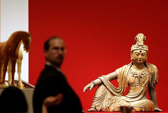 15日,一尊中國(guó)木雕造像在美國(guó)紐約克里斯蒂拍賣行展出。這尊“水月觀音”木雕造像是中國(guó)11至13世紀(jì)的作品,預(yù)計(jì)拍價(jià)在60萬(wàn)至80萬(wàn)美元。紐約克里斯蒂拍賣行將于3月22日拍賣中國(guó)古董,拍品包括木雕、陶瓷器、玉器、服飾等,總拍價(jià)預(yù)計(jì)將超過(guò)1200萬(wàn)美元。