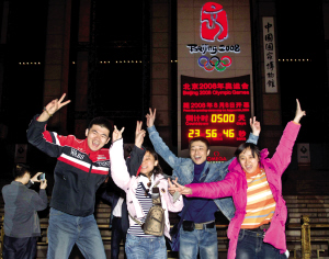 昨天(26日),幾名學(xué)生在中國(guó)國(guó)家博物館門(mén)前的2008年奧運(yùn)會(huì)倒計(jì)時(shí)牌前歡呼留影。當(dāng)晚,北京迎來(lái)2008年奧運(yùn)會(huì)倒計(jì)時(shí)500天。 在迎接奧運(yùn)會(huì)的日子中,北京以及奧運(yùn)會(huì)比賽協(xié)辦城市的每位民眾都對(duì)奧運(yùn)會(huì)有著自己的期待。