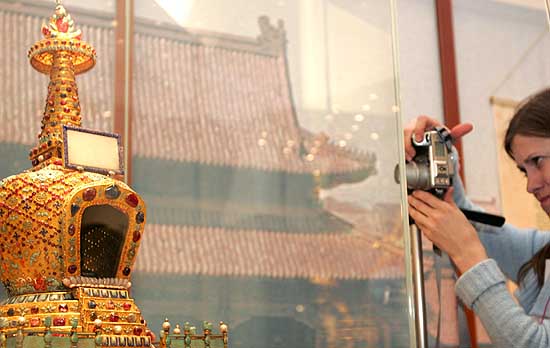 27日,觀眾在俄羅斯首都莫斯科舉行的“故宮博物院藏珍品展”上觀看拍攝。