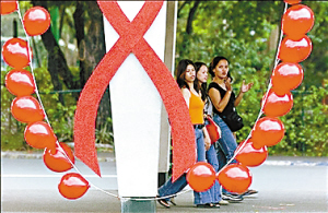 三名菲律賓婦女從象征艾滋病的紅絲帶旁經過。近年來菲律賓感染艾滋病病毒的人數不斷上升。