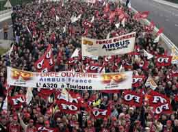 4月3日,在法國(guó)圖盧茲市的布拉尼亞克機(jī)場(chǎng)附近,歐洲空中客車公司的員工舉行游行示威,抗議空客的重組計(jì)劃。根據(jù)重組計(jì)劃,空客將在歐洲裁員一萬(wàn)人,其中法國(guó)4300人。