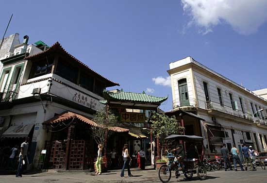 3日,人們?cè)诠虐褪锥脊吣堑娜A人街上行走。在哈瓦那有一條具有濃厚中國(guó)特色的華人街。高懸的大紅燈籠,傳統(tǒng)的街道牌坊,地道的中國(guó)小吃,工整的金字對(duì)聯(lián),讓這條華人街成為哈瓦那一道獨(dú)特的風(fēng)景。