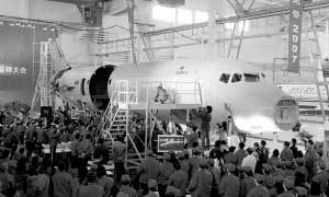 具有自主知識產(chǎn)權(quán)的ARJ21支線飛機在上海飛機廠正式啟動總裝。 本報記者 張海峰攝