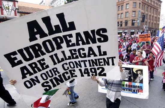 7日,在美國西部城市洛杉磯,游行隊(duì)伍高舉標(biāo)語經(jīng)過市中心的百老匯大街。當(dāng)天,上萬人聚集在美國加利福尼亞州洛杉磯市中心參加示威游行,要求非法移民合法化。