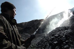 4月8日,在烏魯木齊縣松樹頭煤田火區(qū),天山大峽谷公司的一名工人正在用水“滅火”。據(jù)介紹,煤田滅火是一項危險大、難度很高的工作,需要一整套的工藝,這種“灑水”滅火根本無濟于事。