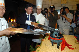 4月24日,全聚德集團(tuán)公司董事長(zhǎng)姜俊賢將從北京前門全聚德烤鴨店老爐鋪中引出的“百年?duì)t火火種”盛放在“全聚德鼎”中,以備封存。