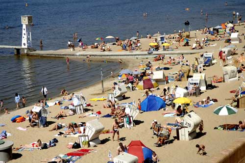 4月28日,市民們?cè)诘聡?guó)首都柏林的一個(gè)湖濱浴場(chǎng)享受陽光。由于高溫天氣提前到來,該湖濱浴場(chǎng)于當(dāng)日正式向公眾開放,開始今年夏季的運(yùn)營(yíng)。