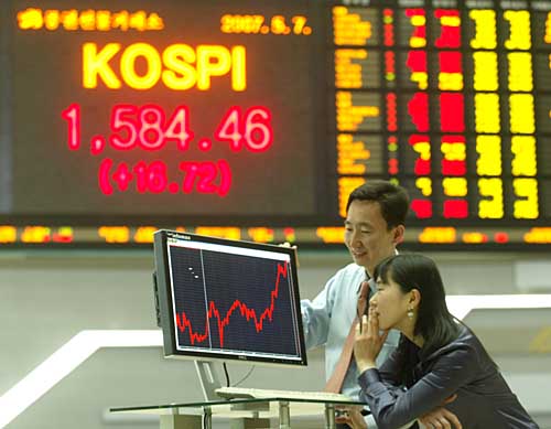 7日,韓國工作人員在首都首爾的證券交易所內(nèi)查看股票價格。當天,韓國首爾股市綜合指數(shù)以1584.46點收盤,創(chuàng)歷史新高。