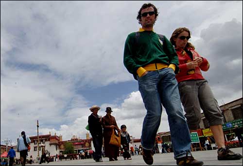 5月1日,兩名外國(guó)游客從大昭寺廣場(chǎng)前走過(guò)!拔逡弧甭糜吸S金周期間,西藏共接待游客33.9695萬(wàn)人次,比上年同期增長(zhǎng)32.6%;旅游總收入首次突破一億元,達(dá)到13556萬(wàn)元,同比增長(zhǎng)31%。