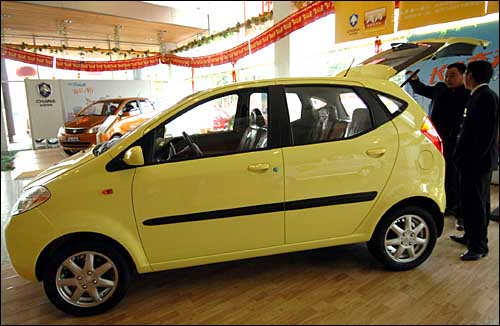 消費(fèi)者正在觀看一輛長安奔奔汽車。200輛長安奔奔近日從長江重慶港裝船,踏上出口阿爾及利亞的旅程。這是長安奔奔自去年底上市并在國內(nèi)市場持續(xù)熱銷以來首次向海外出口。作為長安汽車集團(tuán)的首款自主品牌轎車,長安奔奔在低端轎車市場中憑借低價(jià)格與高配置的優(yōu)勢,對同類車型構(gòu)成嚴(yán)重威脅。短短4個(gè)月,奔奔銷量已達(dá)3萬輛。