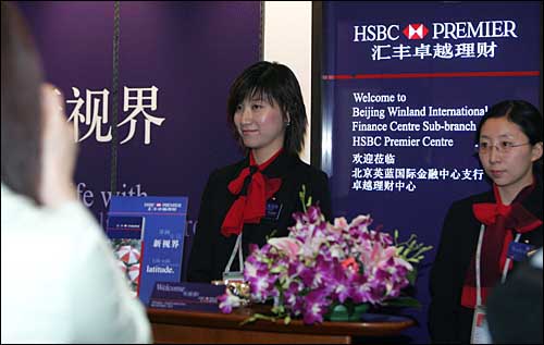 5月10日,在北京金融街正式開業(yè)的匯豐北京英藍(lán)國際金融中心支行的工作人員準(zhǔn)備接待客戶。這是在本地注冊后,入駐北京金融街的第一個外資法人銀行。