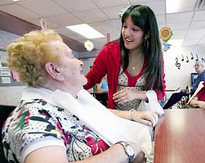 3個(gè)高中學(xué)生踩著上個(gè)世紀(jì)60年代的“扭扭舞”音樂的節(jié)拍跳舞,努力使他們前面的50名老年觀眾的情緒振奮起來。一些觀眾輕輕地?fù)u動(dòng)他們的椅子或輪椅,或有節(jié)奏地鼓掌或點(diǎn)頭。另一些只是靜靜地觀看,盡管音樂聲分貝很高,仍然有幾個(gè)人在打瞌睡。 這是紐約“皇后大道老年護(hù)理中心”的一個(gè)“音樂治療班”在上課。這3個(gè)姑娘擔(dān)任兼職醫(yī)師。目前,紐約城正在推進(jìn)一個(gè)鼓勵(lì)高中生為老年人服務(wù)的職業(yè)培訓(xùn)計(jì)劃。這3個(gè)姑娘目前都在讀高中,他們希望將來能做一名娛樂治療醫(yī)師,為老年人和殘疾兒童服務(wù)。 《年輕的老年學(xué)家》雜志進(jìn)行的職業(yè)培訓(xùn)計(jì)劃是一個(gè)龐大的“20年計(jì)劃”——“兩代間勤工助學(xué)計(jì)劃”的一部分。