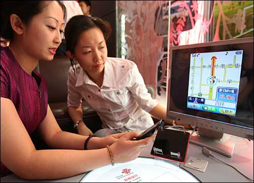 5月17日,一名工作人員在為參觀者展示手機(jī)的電子導(dǎo)航功能。當(dāng)日,中國聯(lián)通與美國某公司在北京中關(guān)村建成CDMA體驗(yàn)中心。