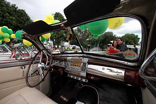 3日,在委內(nèi)瑞拉的馬拉凱市,參觀者在各式老爺車前留影。委內(nèi)瑞拉文化部主辦的第一屆國際收藏和古董博覽會當天在馬拉凱開幕,博覽會上舉行了老爺車游行、老照片展覽以及其他一些機構(gòu)和私人收藏品的展覽。