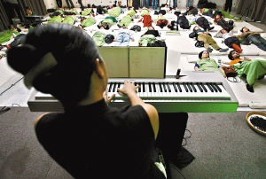 3月9日,在西班牙首都馬德里舉行的一場“睡眠”音樂會上,一名日本鋼琴家在眾多逐漸進入夢境的聽眾前演奏。這名鋼琴家在音樂會上演奏舒緩的音樂,讓聽眾精神完全放松而進入夢鄉(xiāng),最新研究顯示英國人普遍睡眠不足。 | 本報綜合報道