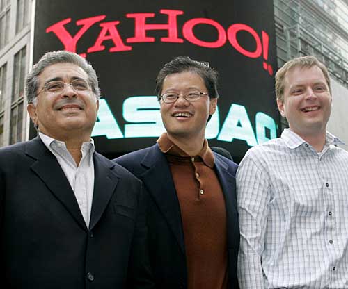 美國(guó)著名網(wǎng)絡(luò)搜索公司“雅虎”6月18日宣布重大高層變動(dòng),原任董事長(zhǎng)兼首席執(zhí)行官的特里·塞梅爾辭去首席執(zhí)行官職務(wù),公司創(chuàng)始人之一、美籍華人楊致遠(yuǎn)出任首席執(zhí)行官,從而重掌雅虎門(mén)戶。這張2005年3月2日拍攝的資料照片顯示,楊致遠(yuǎn)(中)與塞梅爾(左)以及“雅虎”公司另一創(chuàng)始人菲洛在美國(guó)時(shí)報(bào)廣場(chǎng)合影。