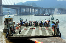 廣東九江大橋坍塌事故發(fā)生后,給佛山市南海區(qū)九江鎮(zhèn)、鶴山市兩岸的摩托車和行人的出行帶來不便。為緩解這一狀況,經(jīng)過多日來的論證、評(píng)估、試航等準(zhǔn)備工作,交通部門6月21日上午6時(shí)重新啟用九江戰(zhàn)備碼頭。