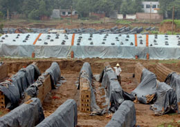 6月23日,工人在河南省上蔡縣肖李王村一個(gè)亂占耕地的磚瓦窯場(chǎng)工作。據(jù)介紹,河南省上蔡縣原有磚瓦窯場(chǎng)171座,占用耕地5600多畝,年消耗黏土資源40萬(wàn)立方米。2007年5月,該縣強(qiáng)制拆除了部分非法磚瓦窯場(chǎng),但一些非法窯主利欲熏心,頂風(fēng)違紀(jì),不少磚瓦場(chǎng)又死灰復(fù)燃。