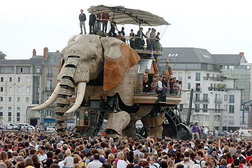 6月30日,在法國西部城市南特,大批民眾圍觀一頭12米高的巨型機(jī)器大象。這頭威風(fēng)凜凜的機(jī)器大象來到這里是為當(dāng)?shù)嘏e行的一個(gè)旅游文化推介活動(dòng)助威。