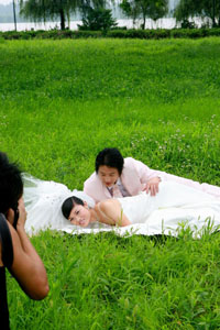 7月15日,一對新人在江蘇省盱眙縣淮河沿岸風(fēng)光帶拍攝婚紗照。