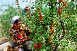 7月16日,寧夏銀川市西夏區(qū)蘆花鎮(zhèn)金田村村民汪秀英在采摘枸杞。 近日,寧夏枸杞進(jìn)入采摘季節(jié),25萬(wàn)農(nóng)戶搶摘枸杞。2007年枸杞收購(gòu)價(jià)格上漲,平均每公斤超過(guò)27元,較上年同期高出八元以上。近年來(lái),寧夏積極扶持和發(fā)展枸杞種植和加工產(chǎn)業(yè),種植面積超過(guò)45萬(wàn)畝,產(chǎn)值已達(dá)到15億元;10萬(wàn)多農(nóng)戶依靠枸杞產(chǎn)業(yè)脫貧致富,40多萬(wàn)人參與枸杞種植和深加工創(chuàng)收。 |