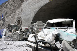 7月23日,從青海省安監(jiān)局了解到,7月20日1時(shí)許,拉西瓦水電站工地左岸高邊坡發(fā)生山體滑坡事故,800多立方米土石滑落。其中不少土石下墜300多米后落入正在澆灌混凝土的電站大壩17號(hào)壩段,造成七名施工人員當(dāng)場(chǎng)死亡,另有一名在左岸卸料平臺(tái)工作的人員被石塊砸成重傷,經(jīng)搶救無(wú)效死亡。目前,事故中受傷的11名人員正在西寧、貴德等地的醫(yī)院治療,已無(wú)生命危險(xiǎn)。 圖為混凝土澆筑平臺(tái)上的指揮車輛和運(yùn)輸車被砸毀。 |