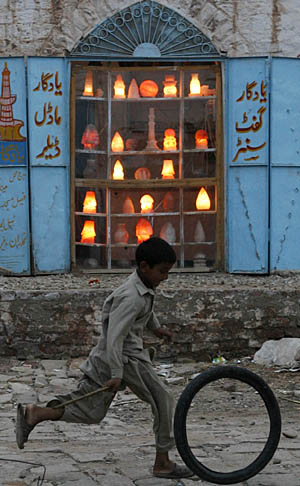 4日,一名男孩在巴基斯坦凱沃拉的一個(gè)鹽礦石工藝品櫥窗前玩耍。巴基斯坦的凱沃拉以其石鹽礦聞名,許多當(dāng)?shù)厝艘灾谱鼷}礦石工藝品為生,一名工人每天的報(bào)酬平均為250盧比(約合5美元)。