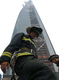 8月14日,消防員在發(fā)生火災(zāi)的上海環(huán)球金融中心工地滅火搶險。 當(dāng)日下午16時30分左右,位于上海浦東的環(huán)球金融中心在建大廈失火。上海市公安、消防部門趕赴現(xiàn)場撲救。到17時45分左右,火勢被消防部門撲滅。這起事故中沒有人員傷亡,具體事故原因還在進(jìn)一步調(diào)查中。
