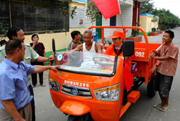 8月29日,濟(jì)源市承留鎮(zhèn)大峪新村村民參觀配發(fā)的清潔環(huán)衛(wèi)車。 當(dāng)日,河南省濟(jì)源市為138個試點村發(fā)放的環(huán)衛(wèi)機(jī)動三輪車全部到位。從今年6月起,該市開展“農(nóng)村清潔”衛(wèi)生行動,為所有鄉(xiāng)鎮(zhèn)免費(fèi)配備垃圾清運(yùn)車輛。 |