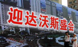 9月4日,兩名大連市民從街頭宣傳牌前走過。世界經(jīng)濟論壇首屆新領軍者年會將于9月6日在大連開幕。目前,大連街頭“達沃斯”氣氛漸濃,大連市民將以巨大的熱情迎接來自國內(nèi)外的嘉賓。