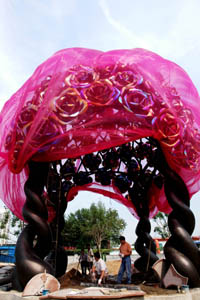 9月5日,工作人員對“玫瑰花亭”雕塑進(jìn)行后期施工。在天津市海河岸邊建造的景觀雕塑“玫瑰花亭”即將建成!懊倒寤ㄍぁ备10米,直徑9.2米,共雕有99朵“玫瑰”。