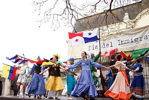 4日,在阿根廷首都布宜諾斯艾利斯移民局前舉行的慶祝移民節(jié)活動上,演員們表演富有拉美和歐洲風(fēng)情的舞蹈。當(dāng)天,包括中國在內(nèi)的30多個國家的移民社團參加了布宜諾斯艾利斯的移民節(jié)慶祝活動。
