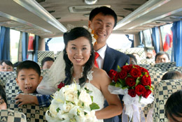 9月16日,參加“公交婚禮”的新人在公交婚慶車上接受親友祝福。當(dāng)日,哈爾濱舉辦首屆“公交婚禮”,三對(duì)來(lái)自哈爾濱不同行業(yè)的新人參加了這次浪漫、環(huán)保的婚禮。據(jù)了解,這是2007年哈爾濱市城市公共交通周及無(wú)車日活動(dòng)之一,旨在提倡節(jié)能減排,保護(hù)環(huán)境,拒絕浪費(fèi)。