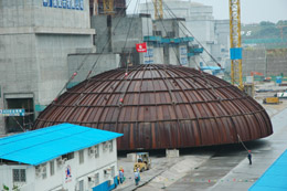 9月23日,在建設中的嶺澳核電站二期工地,巨型吊車將總重量達150多噸的核島穹頂凌空吊起,緩緩移向已完成土建施工的1號機組核島頂部,準確地安放在預定位置。此舉標志著嶺澳核電站二期1號機組核島實現(xiàn)封頂,從土建施工階段全面轉向設備安裝階段。