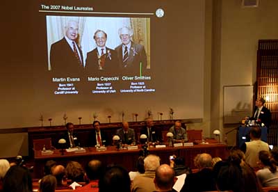 瑞典卡羅林斯卡醫(yī)學(xué)院8日宣布,將2007年諾貝爾生理學(xué)或醫(yī)學(xué)獎(jiǎng)授予美國人馬里奧·卡佩基(中)、奧利弗·史密斯(右)和英國人馬丁·埃文斯(左),以表彰他們?cè)诟脑旎铙w內(nèi)特定基因的“基因靶向”技術(shù)等方面做出的奠基性貢獻(xiàn)。