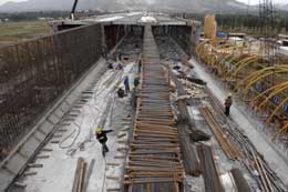10月9日,工人們?cè)谀纤闭{(diào)京石段漕河渡槽工程工地施工。 位于河北省滿城縣境內(nèi)的漕河渡槽工程是南水北調(diào)中線京石段應(yīng)急供水工程的重要組成部分,是目前國(guó)內(nèi)最大的輸水渡槽。目前,該工程主體工程——槽身已經(jīng)澆筑74跨,其余兩跨也將于11月底全部完成。南水北調(diào)中線京石段應(yīng)急供水工程南起石家莊,北至北京團(tuán)城湖。 |