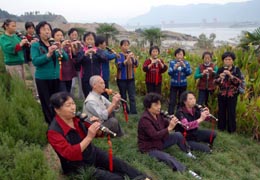 10月9日,湖北省秭歸縣一些移民在三峽壩前公園里學(xué)習(xí)演奏葫蘆絲。秭歸縣是三峽庫(kù)區(qū)移民人數(shù)較多的縣,動(dòng)態(tài)移民達(dá)10萬(wàn)人。移民搬遷后,縣里成立舞蹈隊(duì)、樂器演奏隊(duì)、健身隊(duì)等,以多種多樣的休閑活動(dòng)豐富移民生活。