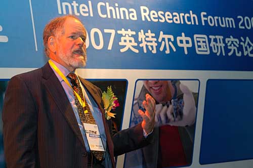 10月10日,“2007英特爾中國(guó)研究論壇”在北京舉行,論壇展示了來(lái)自英特爾中國(guó)研發(fā)機(jī)構(gòu)的40多項(xiàng)最前沿的科研成果。 本屆論壇以“源動(dòng)創(chuàng)新,恒致千里”為主題,旨在與業(yè)界各方深入探討企業(yè)研發(fā)機(jī)制、可持續(xù)性創(chuàng)新發(fā)展等全球關(guān)注話(huà)題,并共同分享創(chuàng)新方法、成功經(jīng)驗(yàn)以及最新研究成果,感受由科技創(chuàng)新帶來(lái)的激情體驗(yàn)和強(qiáng)勁動(dòng)力。會(huì)上,英特爾還展出了來(lái)自英特爾中國(guó)研究中心及英特爾亞太研發(fā)中心(APRC)的最新研究成果共40余項(xiàng)。 圖為英特爾公司企業(yè)技術(shù)事業(yè)部資深院士兼通信技術(shù)實(shí)驗(yàn)室總監(jiān)康凱文博士在論壇做主題為《建造英特爾創(chuàng)新發(fā)動(dòng)引擎》的演講。 | |