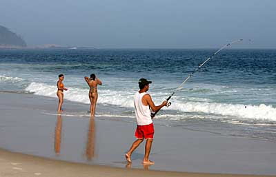 10月30日,一名男子在巴西里約熱內(nèi)盧的海灘釣魚(yú)。盡管這里還處在春季,但溫暖舒適的天氣使得當(dāng)?shù)鼐用褚呀?jīng)提前享受到充滿(mǎn)陽(yáng)光的海灘生活。
